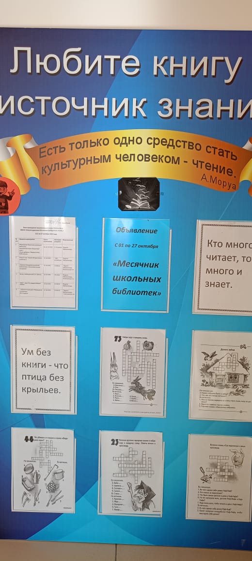 26.10.2025В рамках Международного месячника школьных библиотек, который проходил с1 по27 октября2025 года, в МБОУ " Кошкельдинская СШ им. Сумбулатова А. А- А"проведены следующие мероприятия: выставка"Сказочный мир! ";акция" Подари сказку библиотеке! "; ремонт книг" Вторая жизнь учебнику! ";экскурсия в библиотеку первоклашек;вечер, посвящённый И. А. Бунину; квест- игра" По следам любимых книжек"; библиотечный урок"Посвящение в читатели" 2- х классов. Главная цель работы- привлечь внимание учащихся к школьной библиотеке, как главному информационному ресурсу школы.